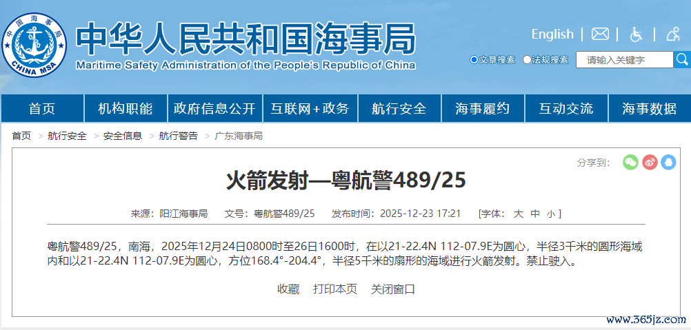 据中国海事局网站音书,阳江海事局发布飞翔训诫,12月24日8时至26日16时,南海部分海域进行火箭放射,装潢驶入。